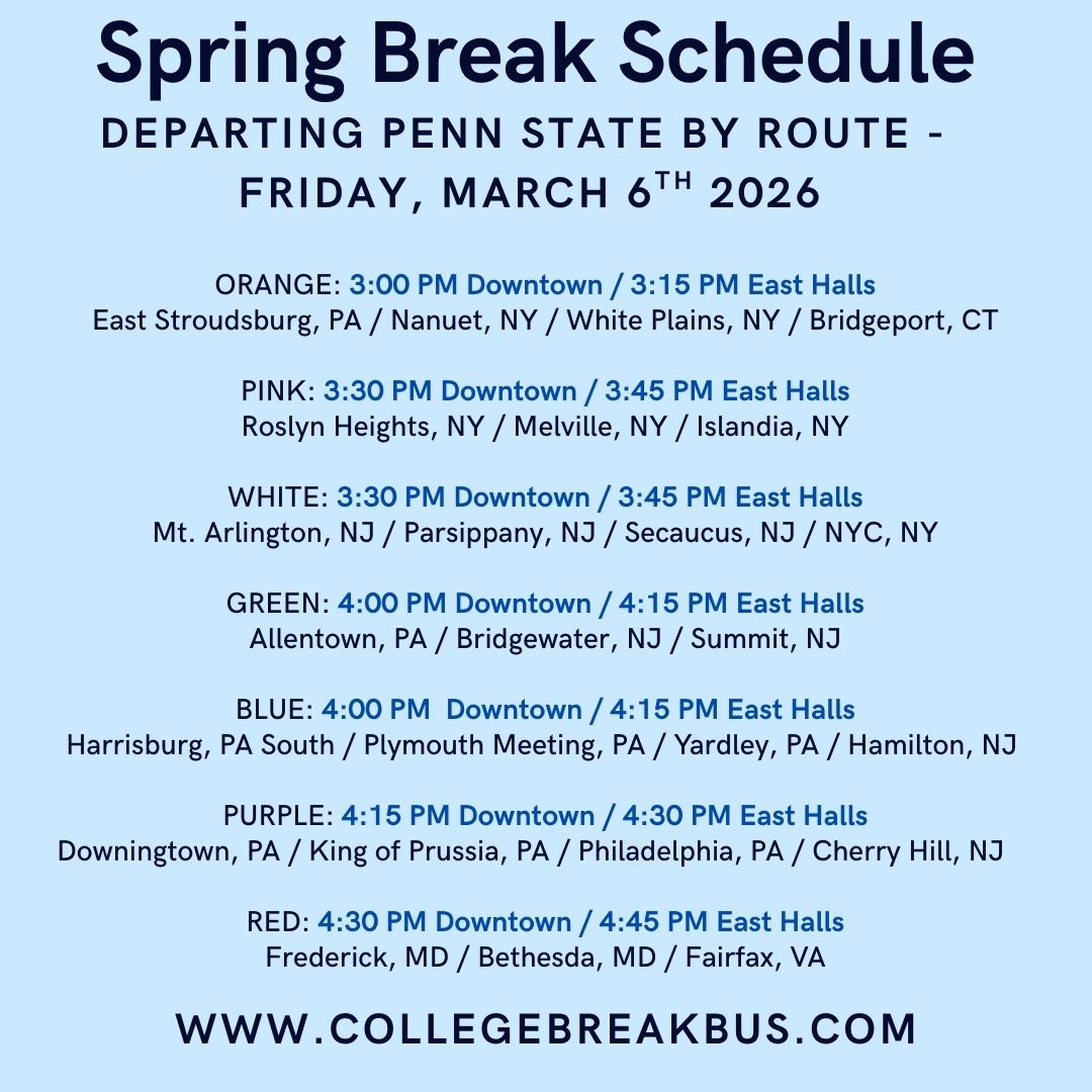 We’re pleased to offer student only buses to and from Penn State University (University Park Campus) for Thanksgiving Break, Winter Break and Spring Break.
