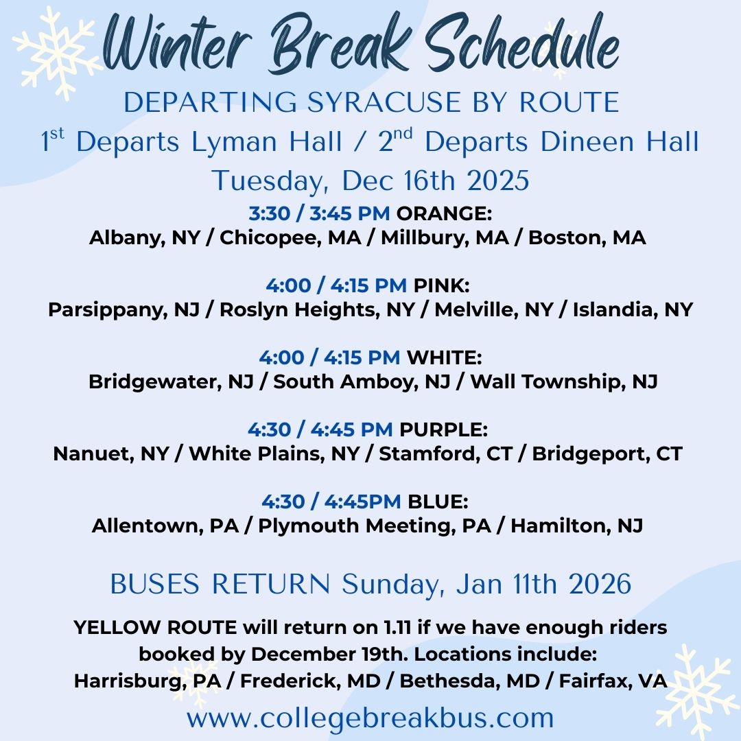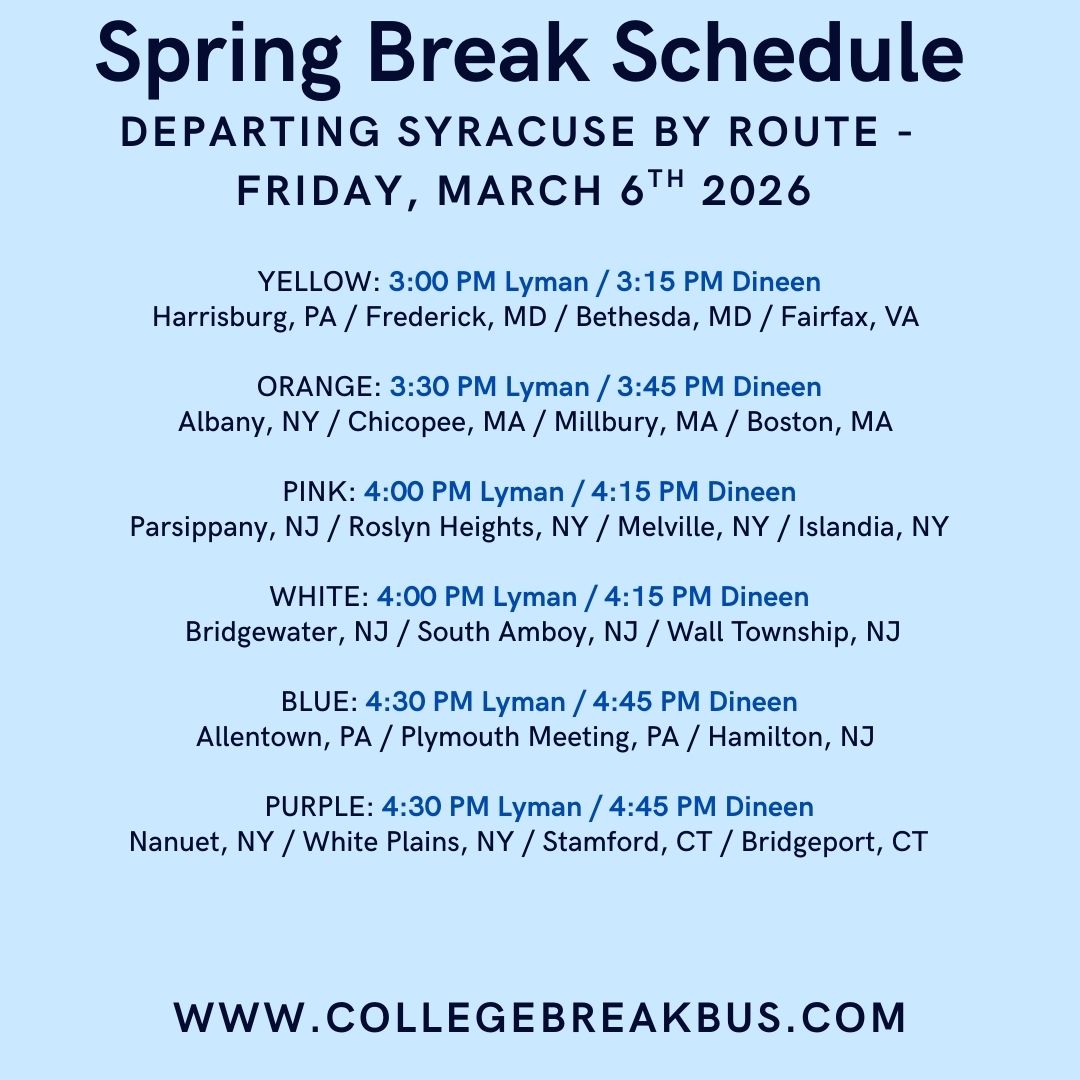 We’re pleased to offer student only buses to and from Syracuse for Fall Break, Thanksgiving Break, Winter Break, and Spring Break.