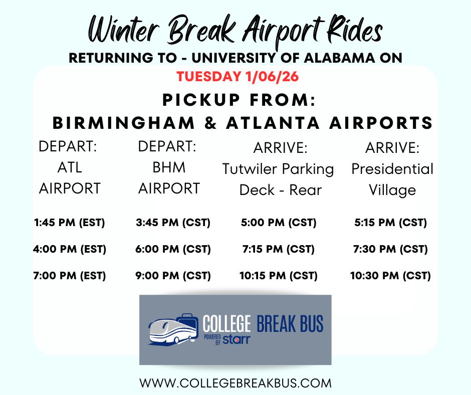 We’re pleased to offer student only buses to and from University of Alabama for Fall Break, Thanksgiving Break, Winter Break, and Spring Break.