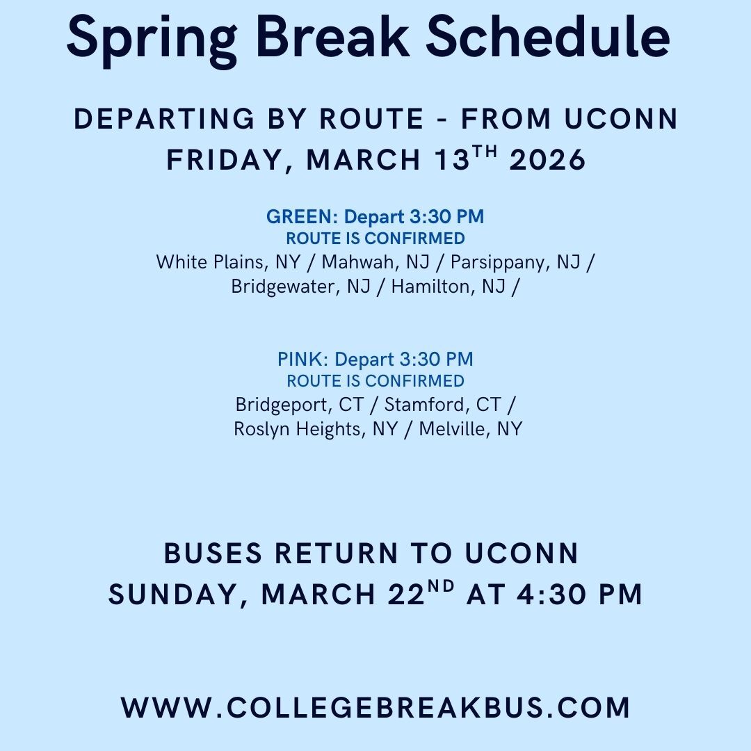 Buses home will depart from UCONN on Friday, March 13th between 4:00PM and 5:00PM