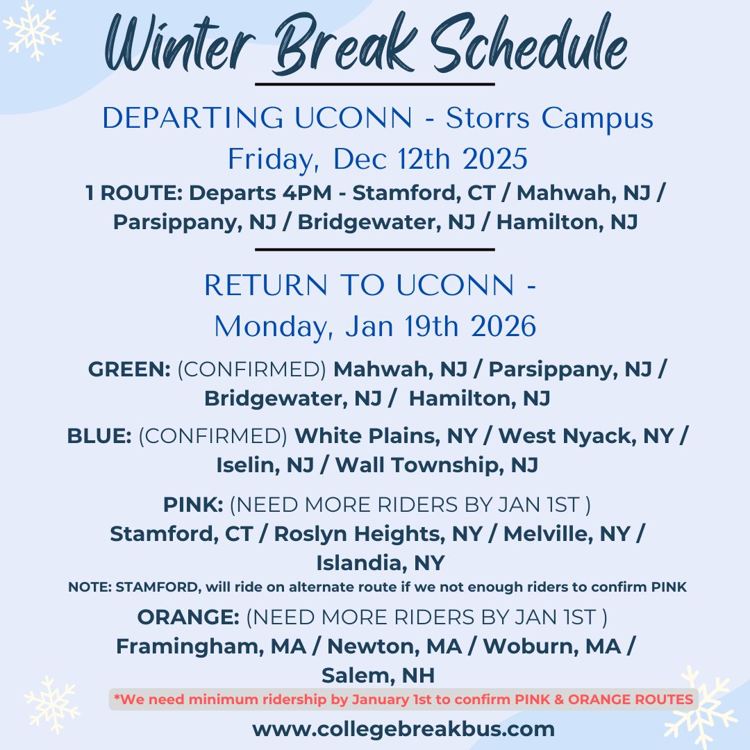 Bus home will depart from UCONN on Friday, December 12th at 4:00PM.