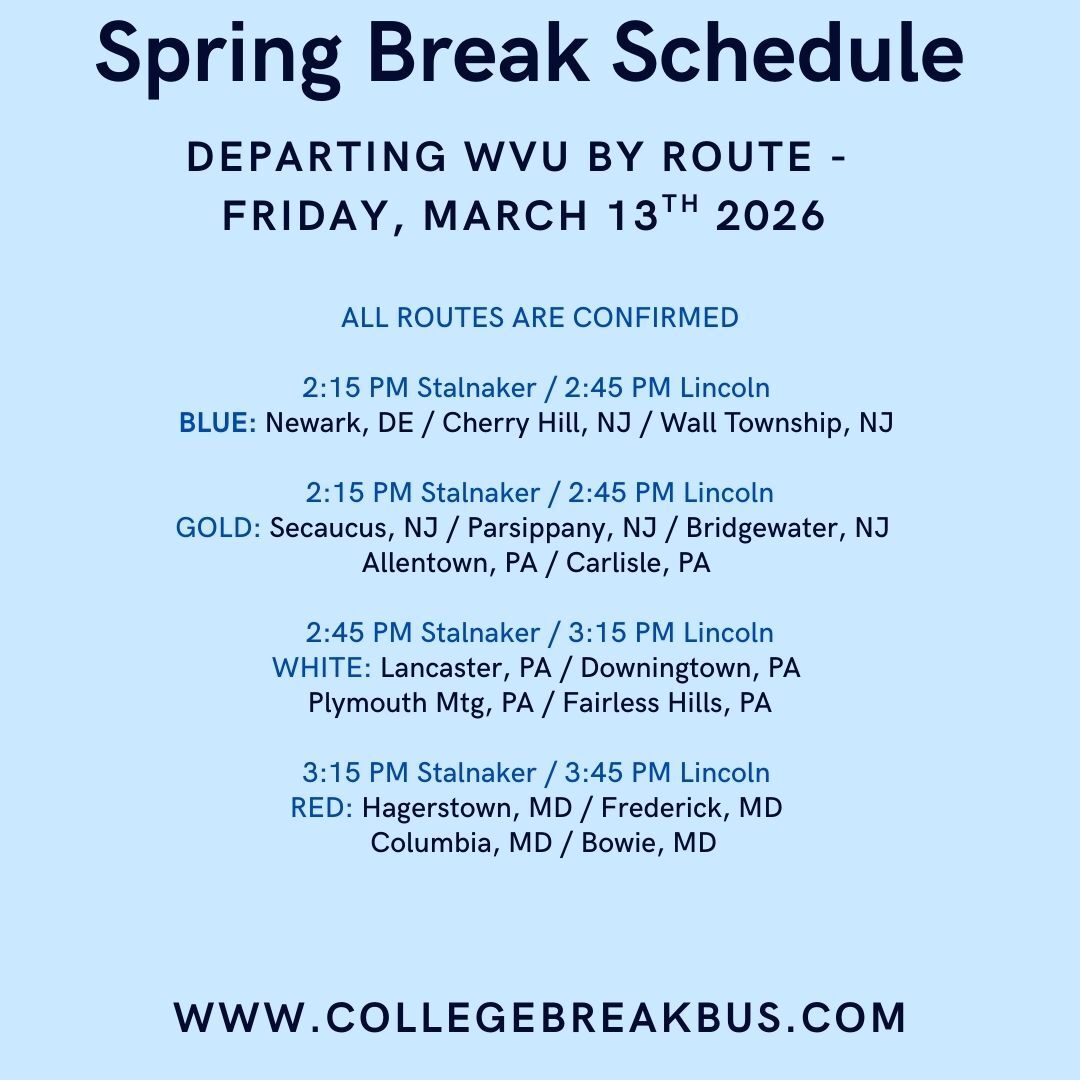 Buses home will depart from WVU on Friday, March 13th between 2:15PM and 3:45PM.